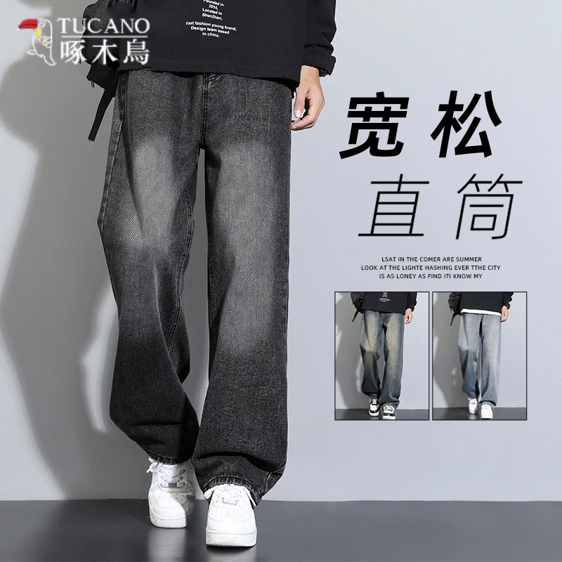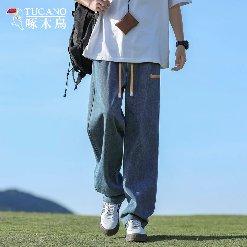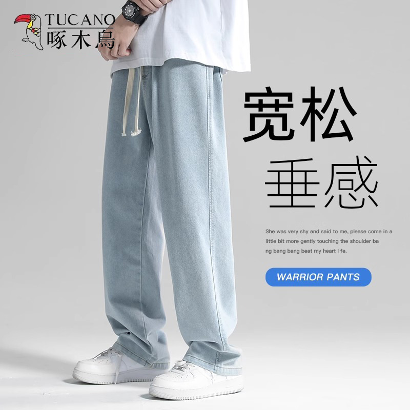 キツツキの薄い青いジーパンの男性の春の夏の2025新型のまっすぐな筒のゆったりしている男子の広足のカジュアルなズボン