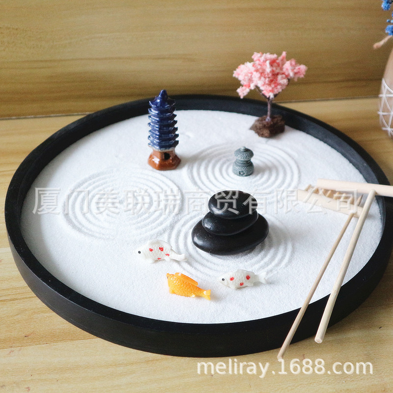 禅意沙盤花園景観樹脂工芸品置物円形装飾砂盤枯山水造景