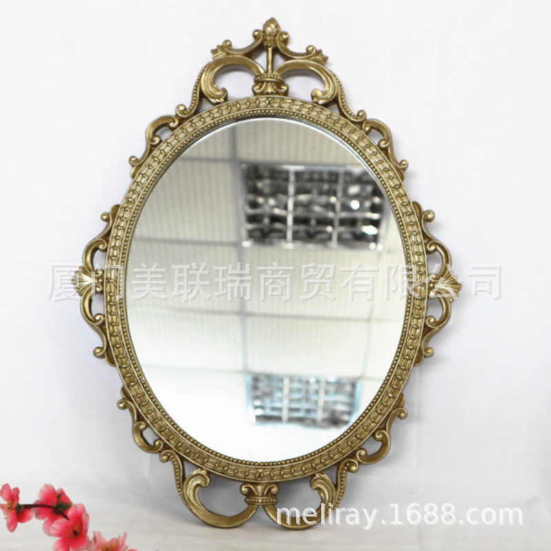 ヨーロッパのレトロな彫刻の花は古い金色の樹脂の化粧の鏡の壁掛けの鏡の枠の家庭の装飾の置物の台をします。