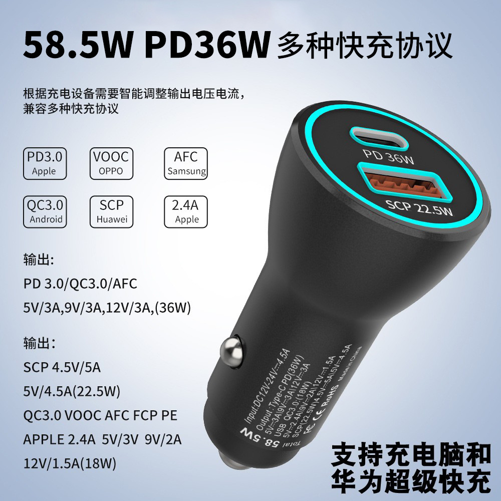 私型自動車車載充電器超速充フラッシュ充電type-c点煙器一引き二口速充電ヘッド