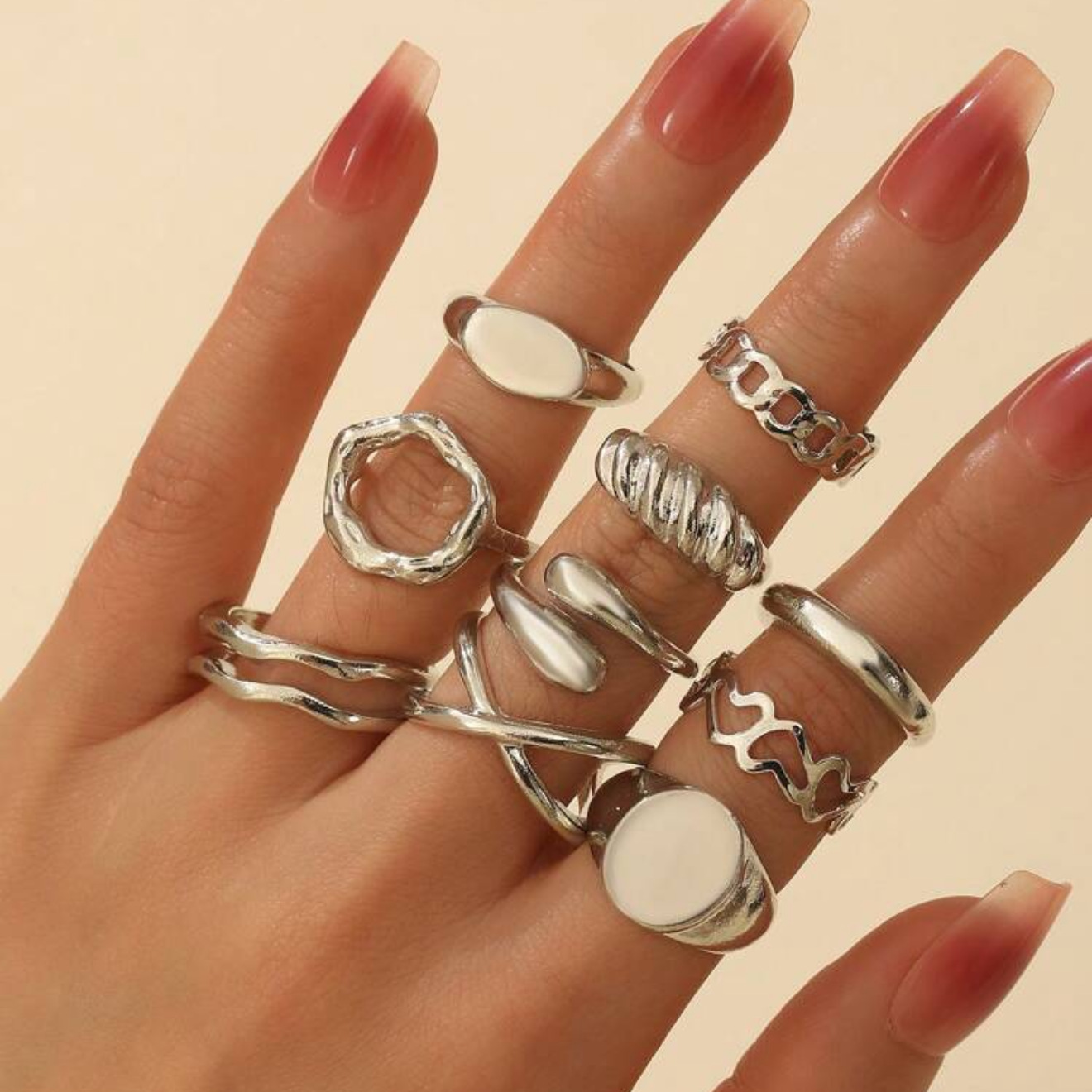 欧米の国境を越えた爆発的なアクセサリーパンク風金属光沢指輪セット誇張幾何学高級指輪関節指輪