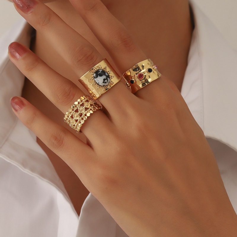 ヨーロッパとアメリカのクロスボーダージュエリーファッションジョイントコンビネーションリングレディースハンドジュエリーヒップホップメタル溶岩宝石リングセット