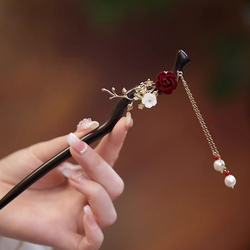 かんざしの女性の古風な髪の飾りのツバキの花のかんざしの赤い足取りのフリンジのチャイナドレスの木のかんざしの髪の団子の頭