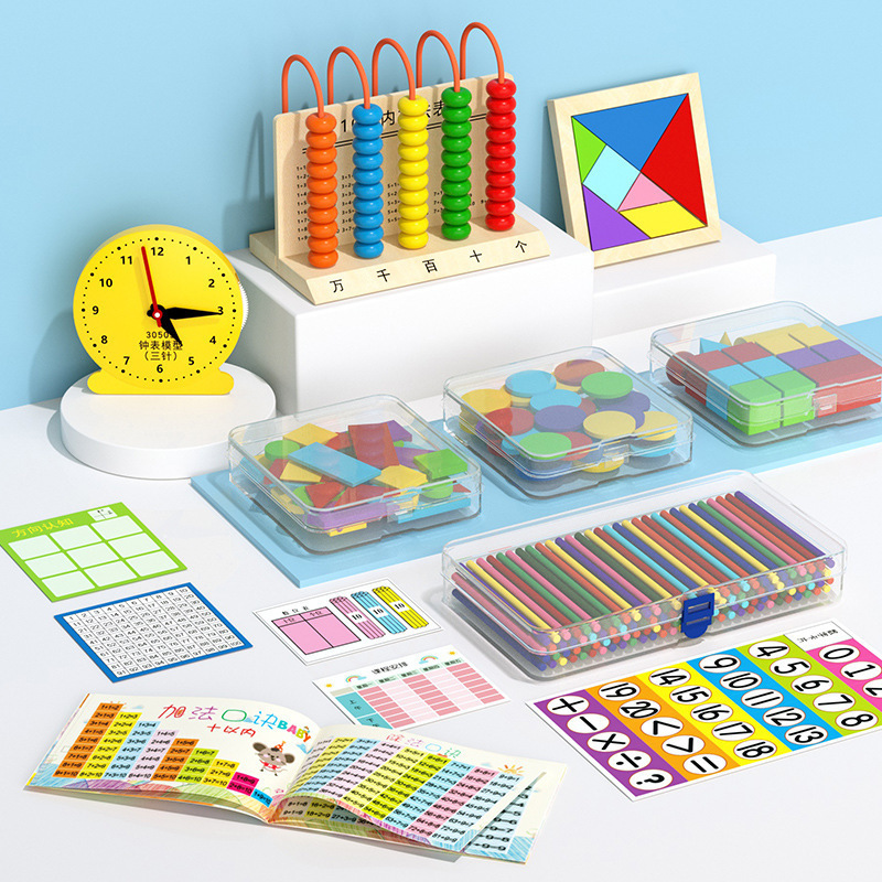 一二年生の数学の教具の上で七巧板の掛け算の勉強用品の数の棒のカウンターのスーツをおります。