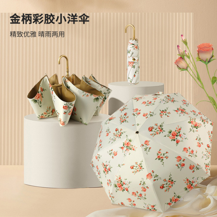 ゴールドフック曲げ柄チタンゴールドパラソル日焼け止め紫外線防止折りたたみ日傘卸売レトロ晴れ傘ギフト女性