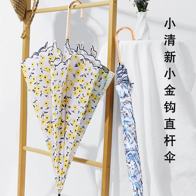 三つ折りの日傘の小さい金のフックの曲がった柄の日除けの傘の晴雨は傘で折り畳みます。
