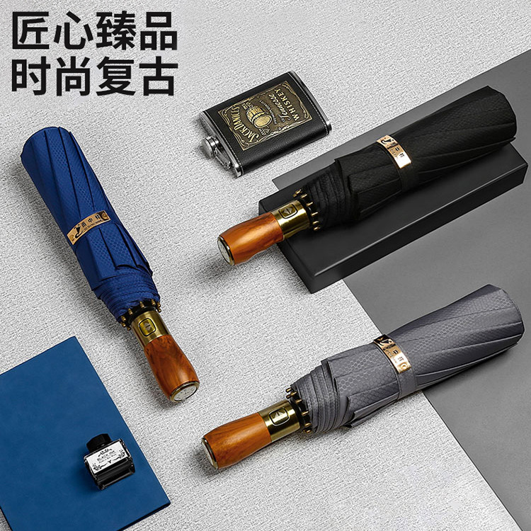 16骨三つ折りオートマチック原木柄雨傘メンズビジネスプラスサイズ折りたたみ晴雨両用広告ギフト傘