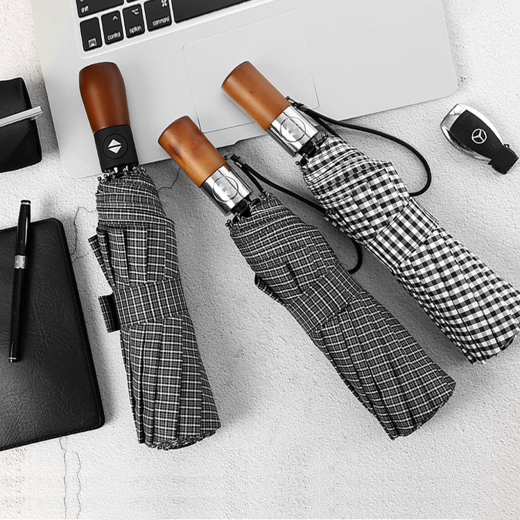 格子三つ折り折り畳み木柄傘全自動女性ビジネス晴傘卸売り定男女同項ロゴ工場