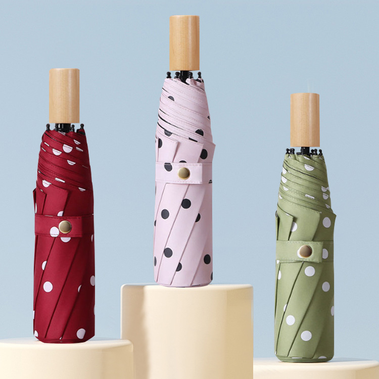 小さい清新な丸い点の3つ折の折り畳みの木の取っ手の女性の暗いゴムの日よけの傘の日傘の贈り物の卸売りの印のロゴ