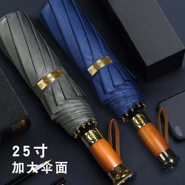 全自動原木柄12骨三つ折り傘メンズビジネスプラスサイズ折りたたみ晴雨両用広告ギフト傘