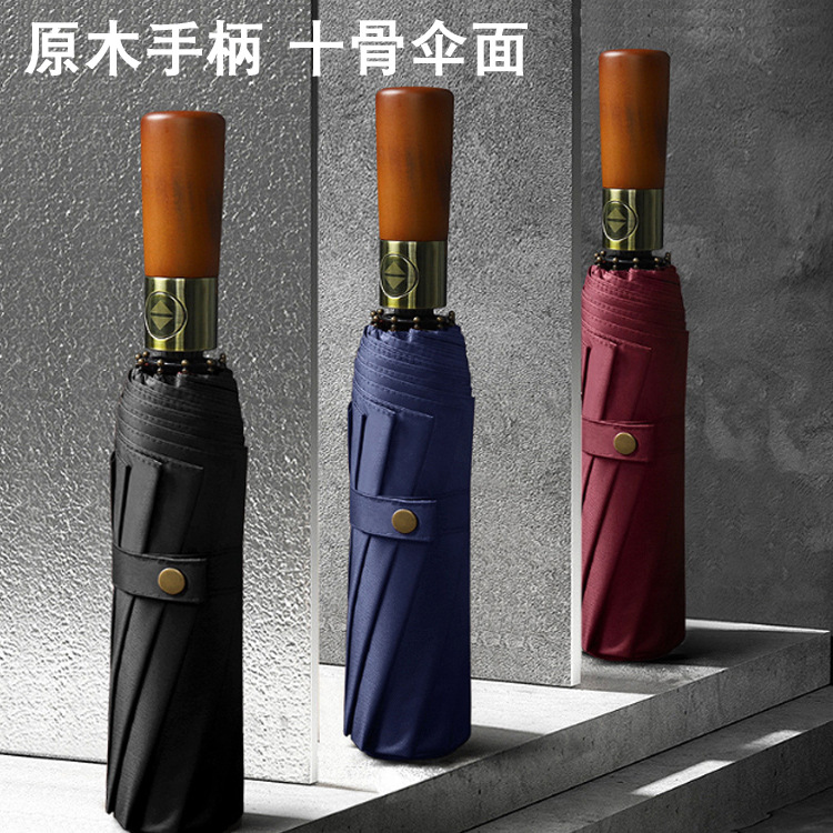 10骨全自動原木柄三つ折り傘メンズビジネスプラスサイズ折りたたみ晴雨両用広告ギフト傘