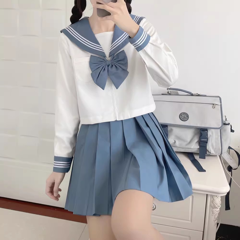 日系刺繍灰三本日系JK制服学院風セーラー服学院風春秋長袖百歪スカートセット