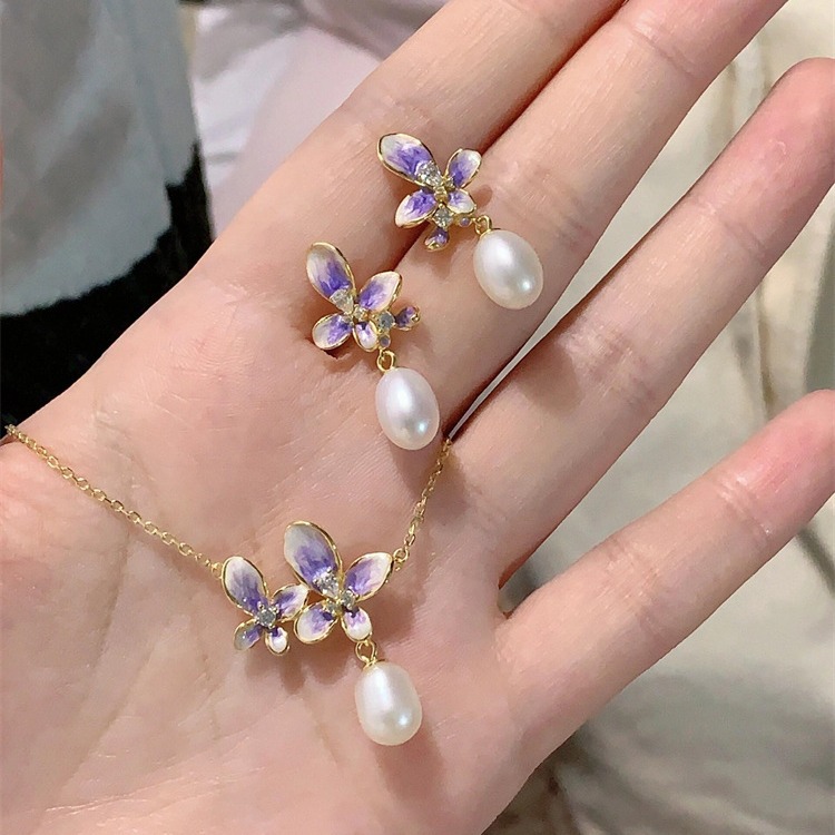 古法焼藍エナメル紫藤花真珠ピアス女性レトロ新中国式小衆気質デザイン高級感耳飾り