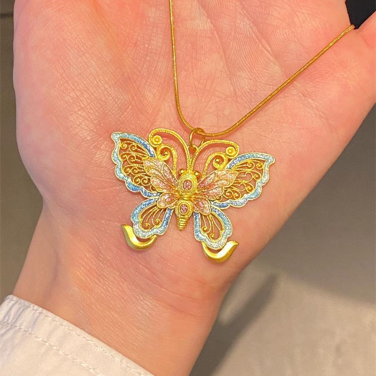 新中国式古法花糸蝶ネックレス女性エナメル彩色油絵感首鎖小衆個性デザイン鎖骨鎖