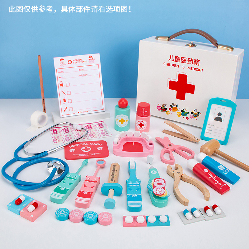 子供の木製の木の箱の薬箱の赤ちゃんの女の子のままごとのシミュレーションの医者はおもちゃのプレゼントを注射します。