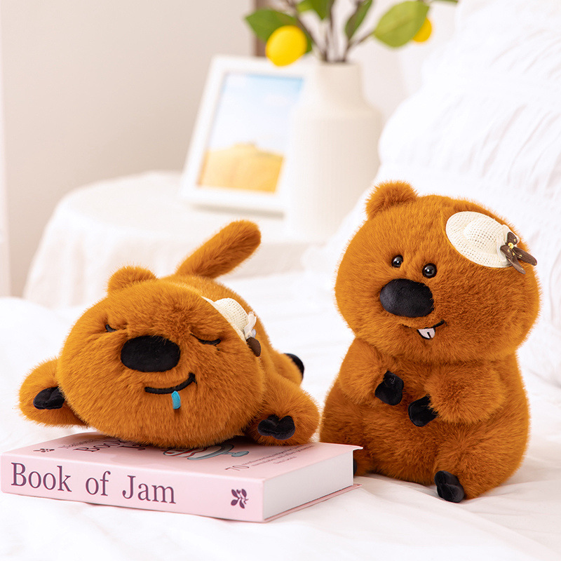 ネットの赤いかわいいボタンの可ちゃんの人形のビーバーのぬいぐるみのぬいぐるみと一緒に寝ます。