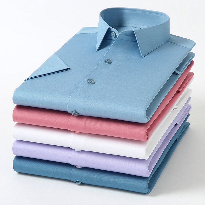 無地ビジネスメンズ半袖シャツ竹繊維通気性ノーアイロンスリムフィットフォーマルシャツロゴ入り
