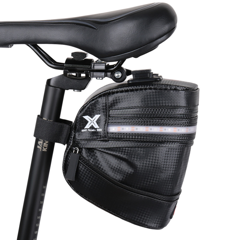 自転車にはランプ付きのテールバッグがあります。光が反射します。