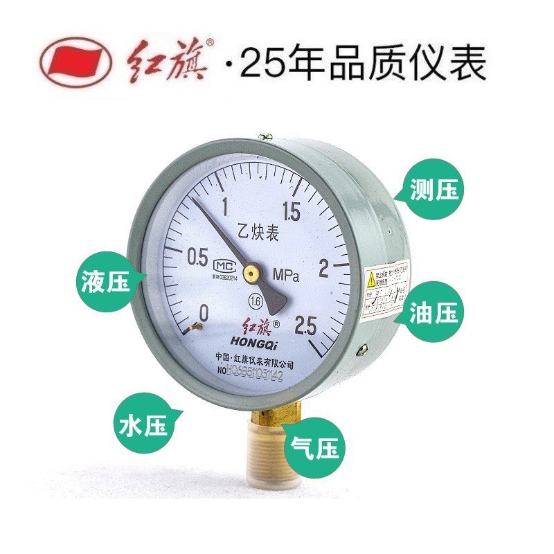 紅旗計器アセチレン圧力計YY-100 1.6級0-1mpa各種ガス圧力計ガス禁止油
