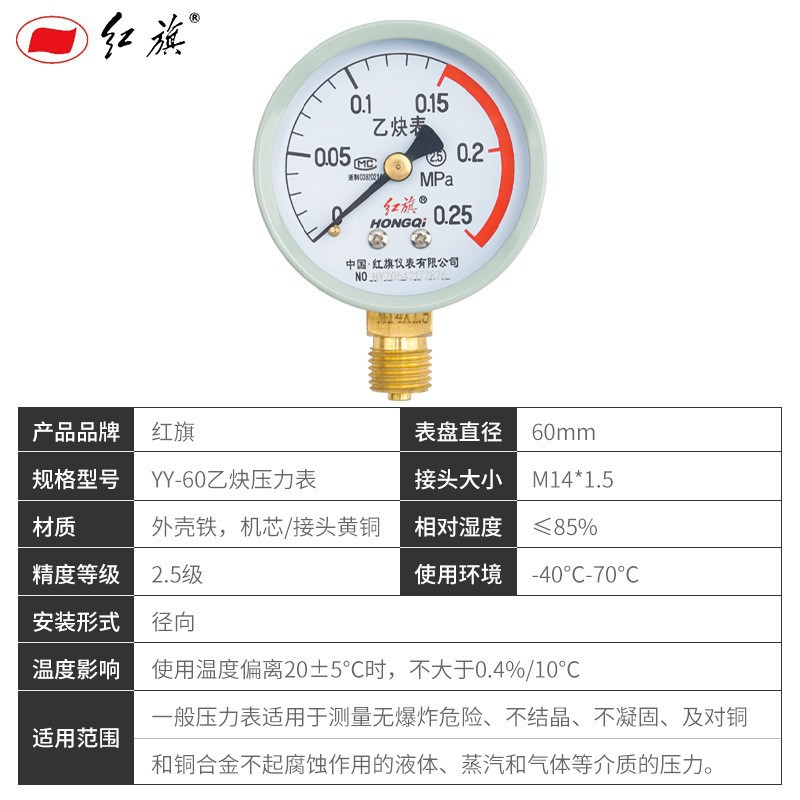 紅旗アセチレン圧力計YY-60 1.25/0.4/0.6/1.6/2.5/4mpa減圧弁表