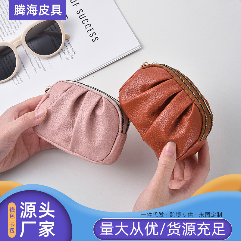 女性用の小さな財布と小銭入れ、シンプル、ファッショナブル、見栄えが良く、多機能、実用的、気質、プリーツ、二層ジッパーコイン