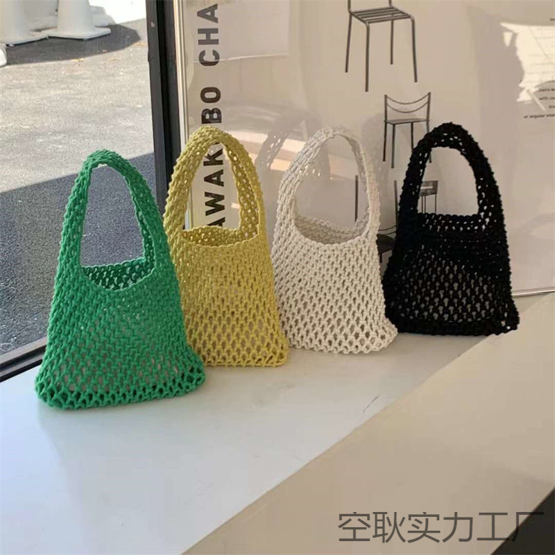 韓国スタイルの中空メッシュクラッチバッグ、手織り綿ロープリストバッグ、ファッショナブルで多用途なビーチバケーションバケットバッグ