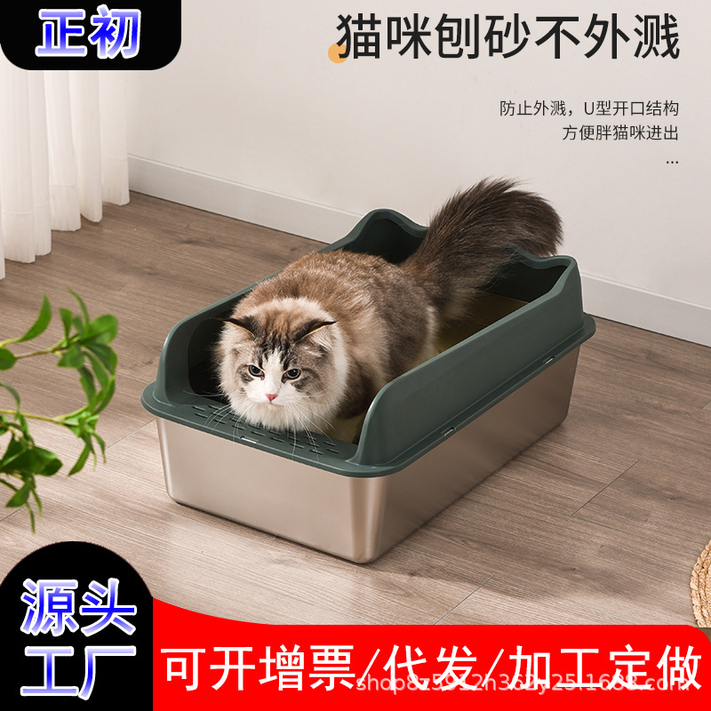 ステンレス製の猫用トイレ、大型、お手入れ簡単、幅広、厚みのある、砂漏れ防止、飛沫防止、広いスペース、半開き猫用トイレ