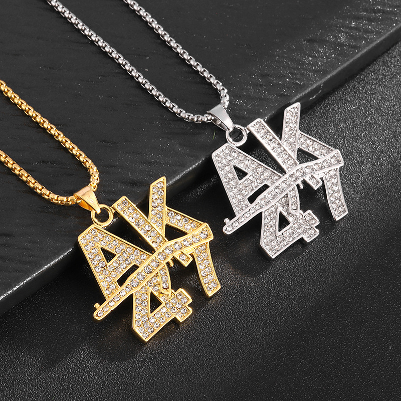 Temu欧米クロスボーダー爆型ヒップホップHIPHOPアクセサリーチタン鋼金メッキダイヤモンドAK47アルファベットペンダントネックレス