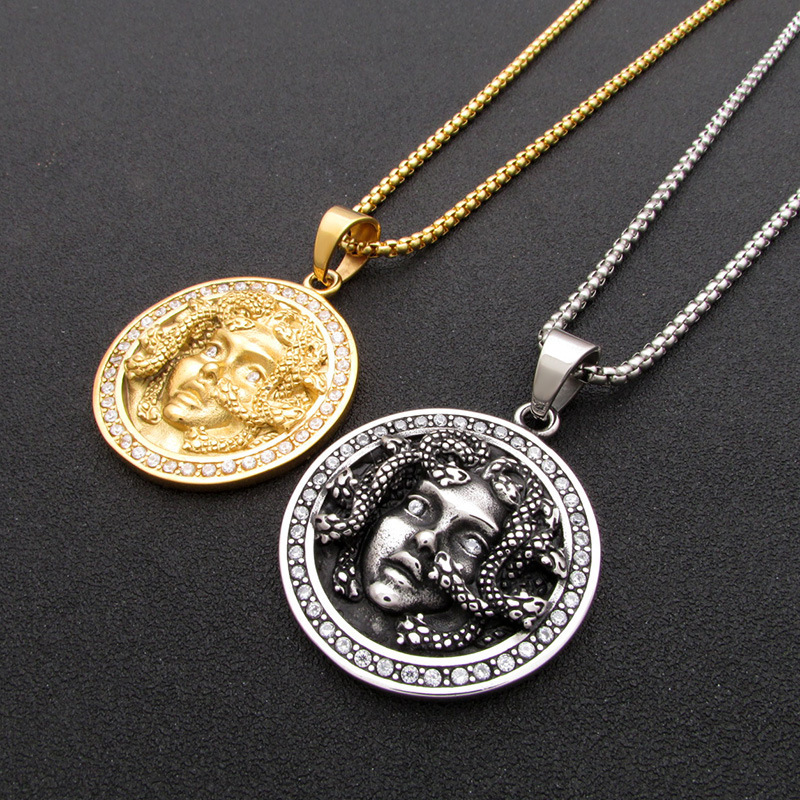 クロスボーダーの熱い販売ギリシャ神話の蛇の女性の美杜莎はダイヤモンドのチタンの鋼のペンダントの復古の装飾の卸売りを入れます。