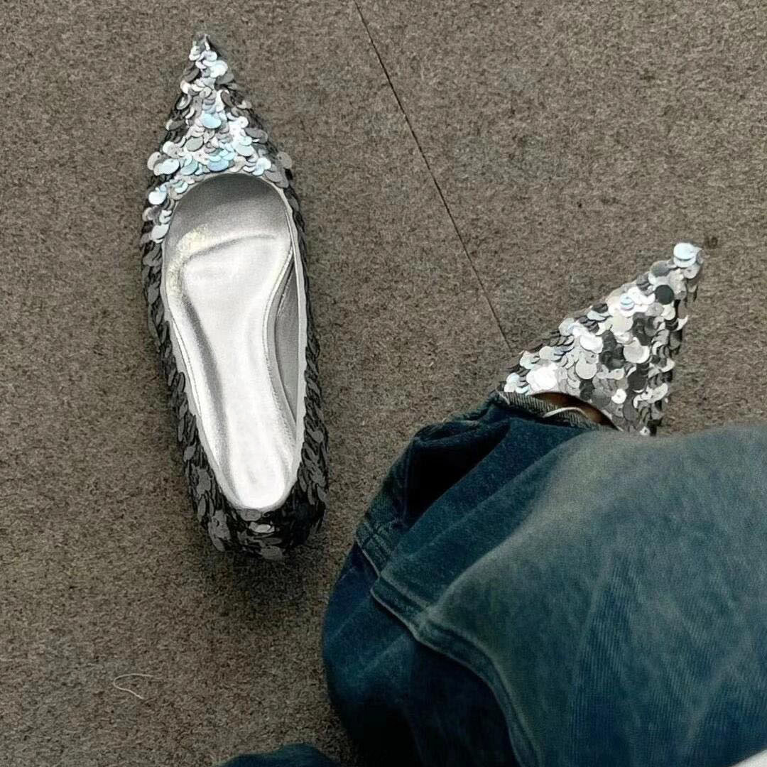 百妙蘭銀色の明るい靴2023秋冬の新型の浅い口の坂と靴の日常の小さい大衆のデザイン感のハイヒールの靴