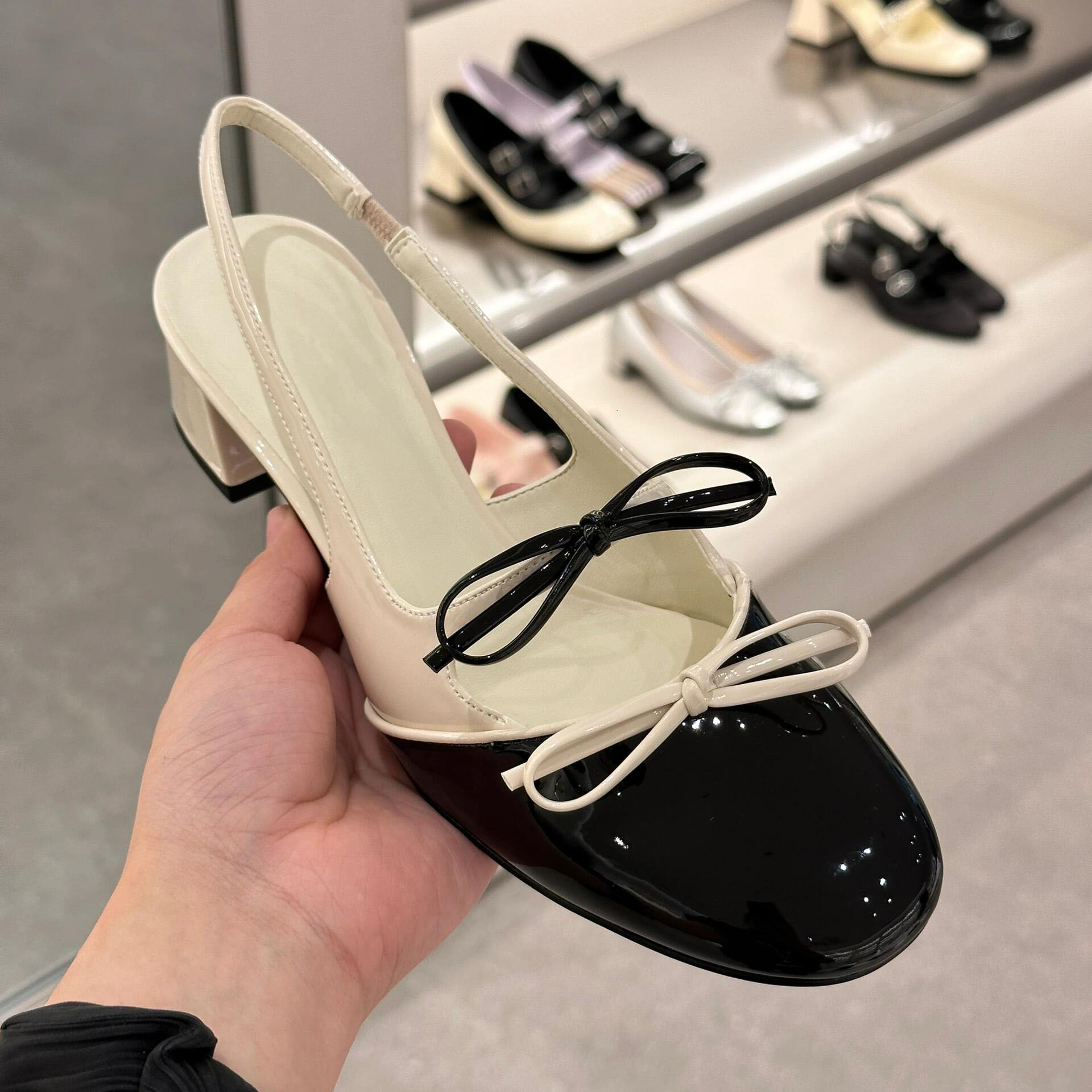 後空サンダル女2024春夏新作包頭蝶結びフランス白黒色合わせバレエ中とメアリージェーン靴