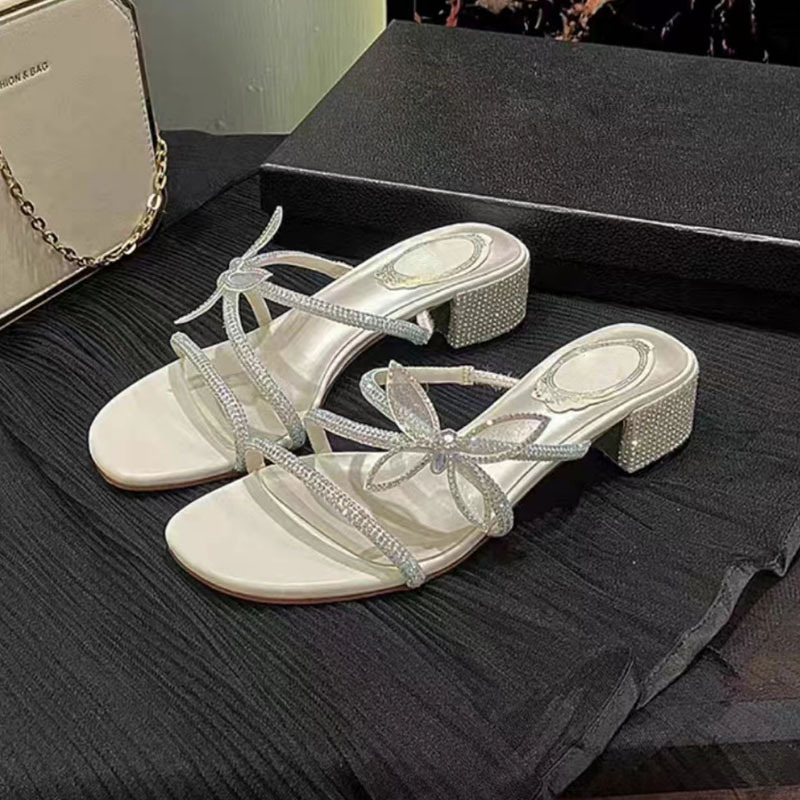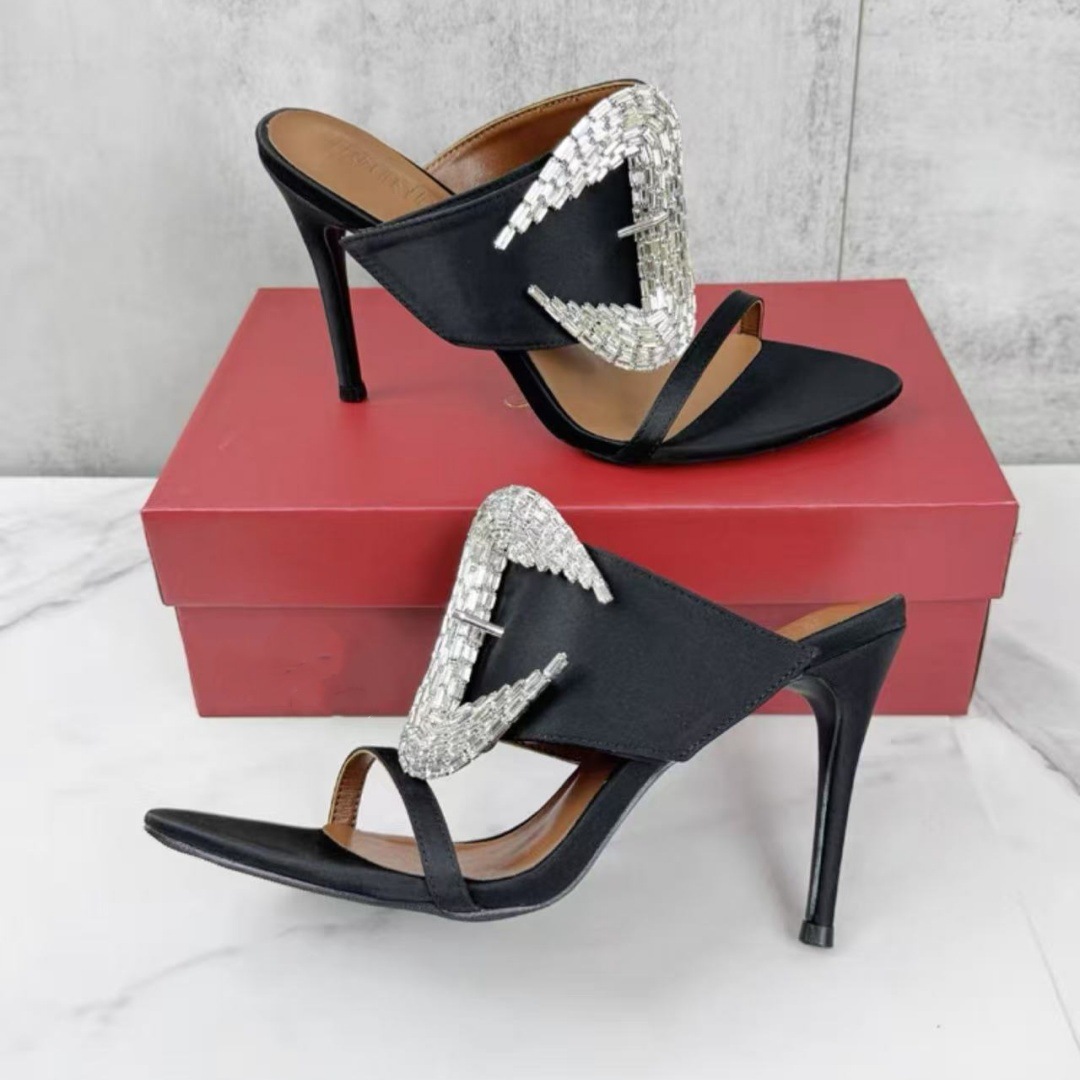2025年夏新作、ヨーロッパとアメリカのスタイル、ラインストーン付きハイヒール、レディースサンダル、細ヒール、外履き、ハート型のラインストーンバックル
