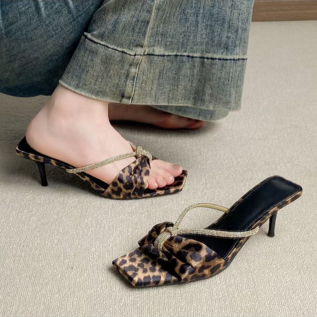 フレンチサテンファッションサンダル女性のための 2025 夏の新しいホットガールセクシーなヒョウ柄ハイヒールアウターウェアサンダルとスリッパ