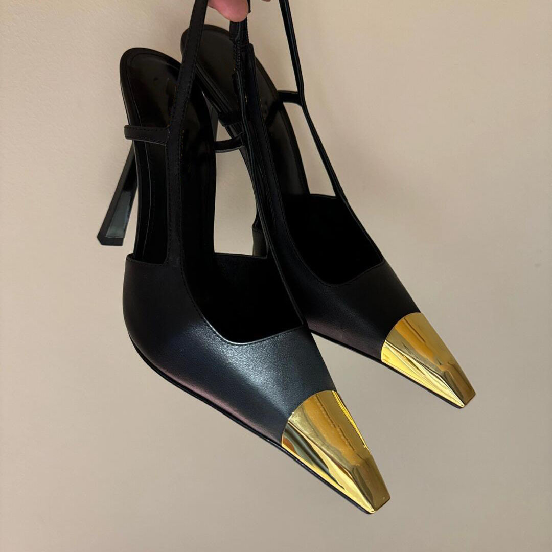 ローズ朴彩英は同じ金の金属の鉄の頭のハイヒールの女性の側のバンドのセクシーな細いと皮の顔の包頭のサンダルです。