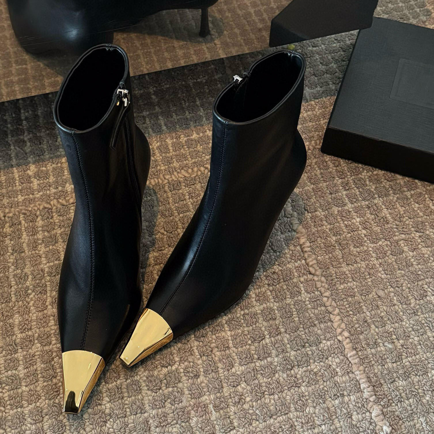 ハイエンド品質2024冬の新型金属の小さい方の頭の中筒の靴のやせている靴の細いヒールの側のファスナーのショートブーツの女性