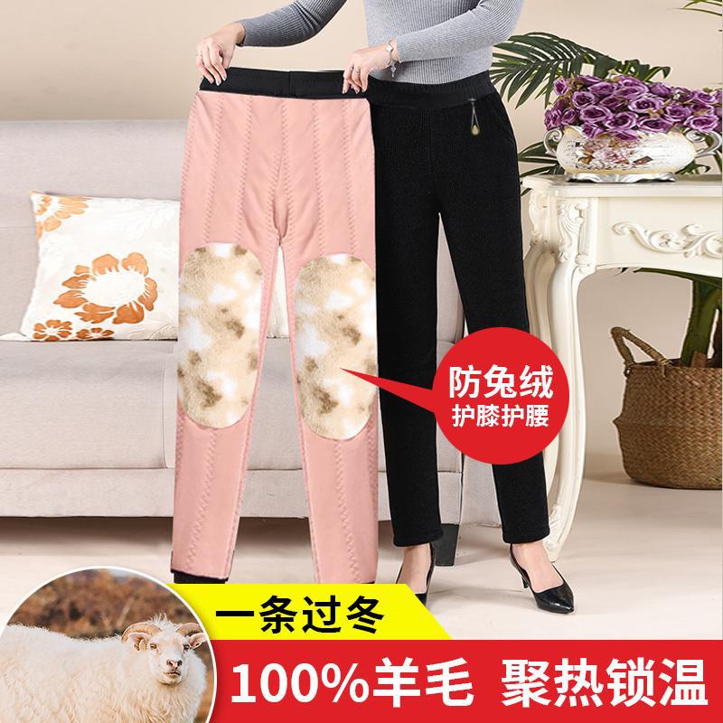ズボンの女性にベルベットをつけてウールのズボンを厚くして、冬のカジュアルな外にパンツを着ている高齢者の母親が腰をかばってズボンを温める