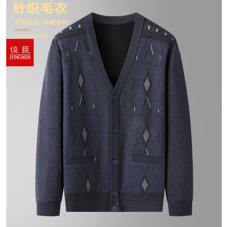 男性用ニットウェアの中高年vネックカーディガンのセーターの上着の男性用上着の長袖の秋冬のベルベットは厚くて暖かいです。