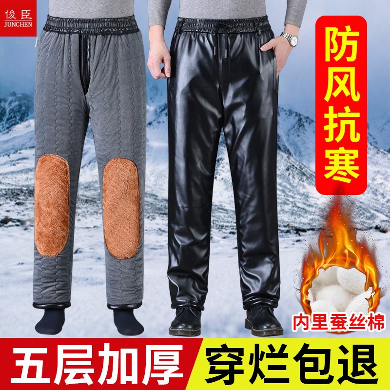 革のズボンの男性式は冬にベルベットをつけて膝を保護して、カジュアルな弾力性のあるお父さんの保温ズボンの中高年に乗っています