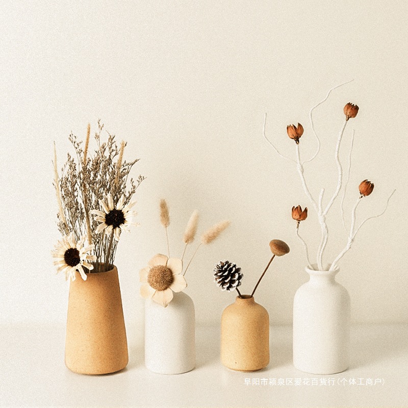 ドライフラワーの花の花の客間にテレビの棚の装飾品を飾っています。
