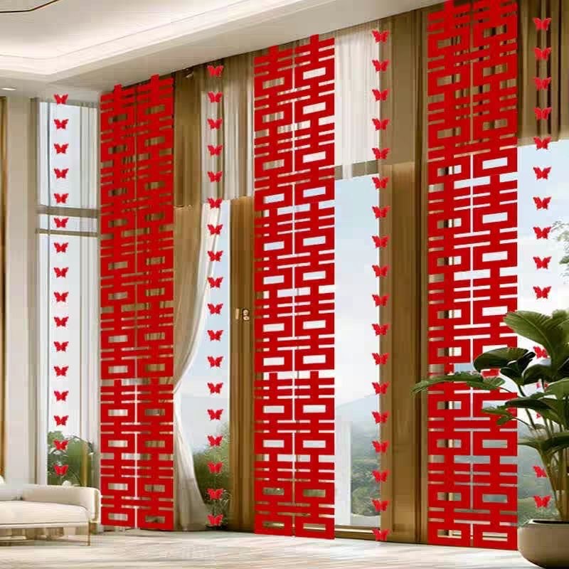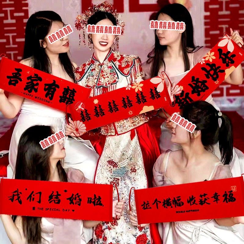 結婚部屋の配置セットの長いリボンの喜字は結婚のカーテンの新しい部屋の寝室の花を飾って結婚式の写真を撮る道具を飾ります。