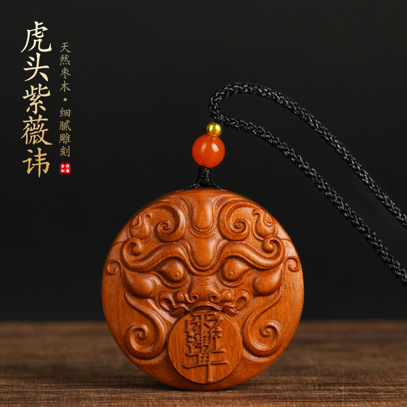 絶妙なナツメ材の文化用品、虎の頭と紫の木のペンダント、無垢材のジュエリー、彫刻された文具、レリーフ、自然な雷撃