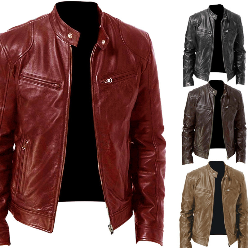 外国貿易秋冬ビジネス紳士保温ジッパーカーディガンポケット装飾pu革服立襟修身大サイズ革ジャケット