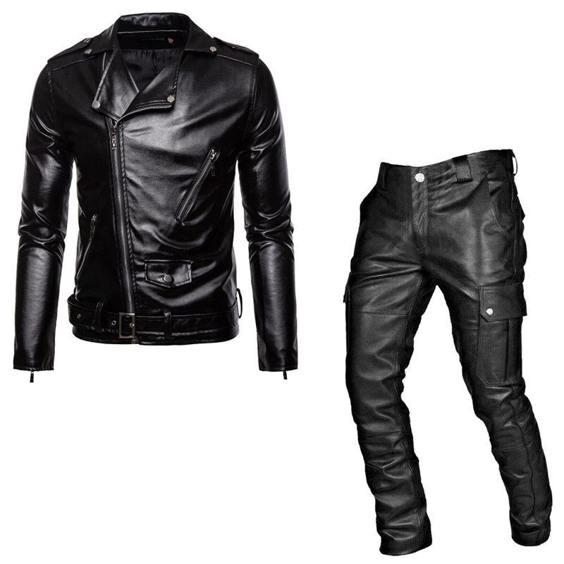 外国貿易の秋の男性の機関車の服のオートバイのスーツの皮のズボンの2つのセットのpu皮のレジャーのスーツの中世の服