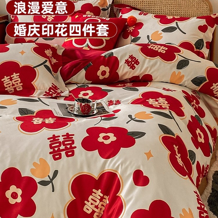 結婚ベッド用品4点セットの結婚祝いの赤い結婚部屋は、磨かれたシーツで覆われた赤い結婚式の布団カバー