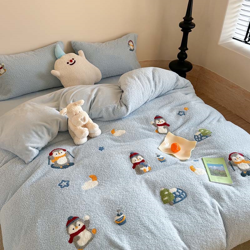 クリームブルー厚手テディパイルタオル刺繍ペンギン4点セット1.5m1.8ミルクパイル秋冬保温