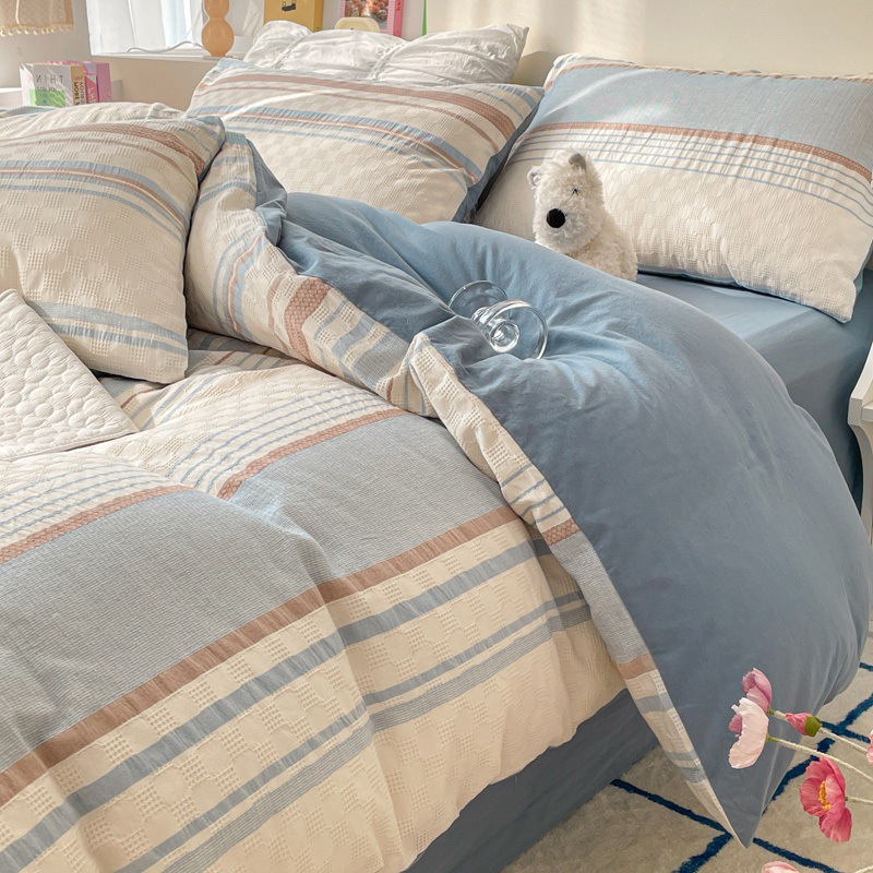 シンプルなストライプの色織水洗い綿四点セット仙粉少女純綿親肌ベッド用品は学生綿シーツを大きくします。