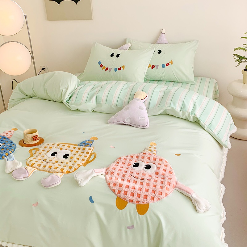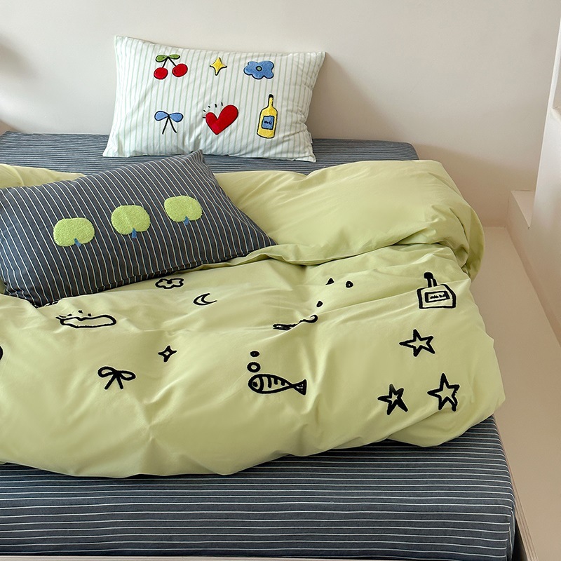 青リンゴins風四点セット綿タオル刺繍清新緑布団カバー韓系少女水洗い純綿ストライプ