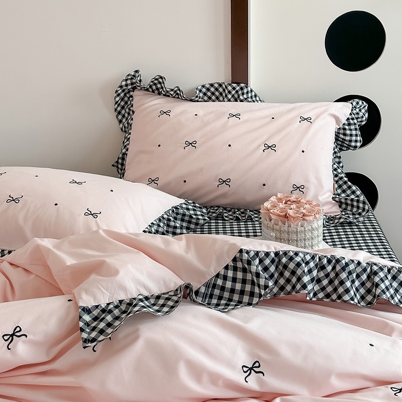 少女の心の水洗い綿の蝶結びの刺繍の花の縁の4つのセットの1.5m 1.8メートルのマンションの綿のシーツの布団カバー