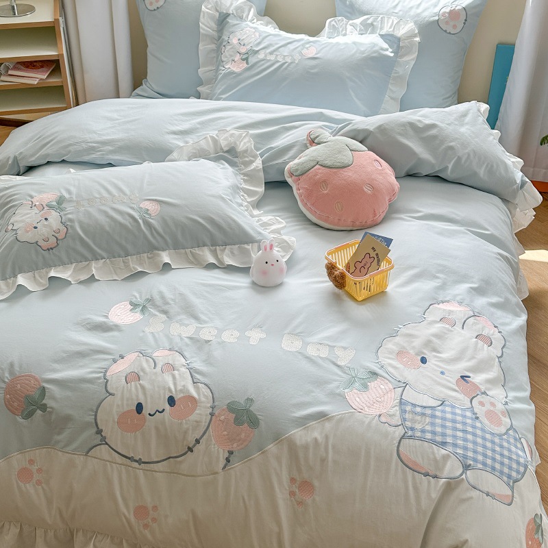 かわいいアニメ風綿100% 水洗い綿4点セットウサギ刺繍レース綿布団カバー1.8 mベッド用品