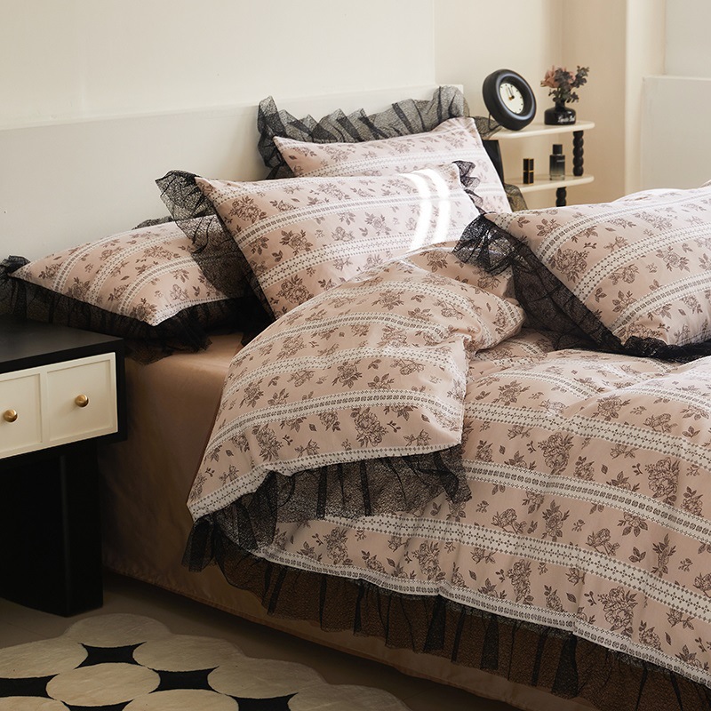 2024春夏の新商品の全綿はフランス式の黒い透かし彫りのレースの小さい花の純綿の3つの4セットの1.5mシーツを覆います。